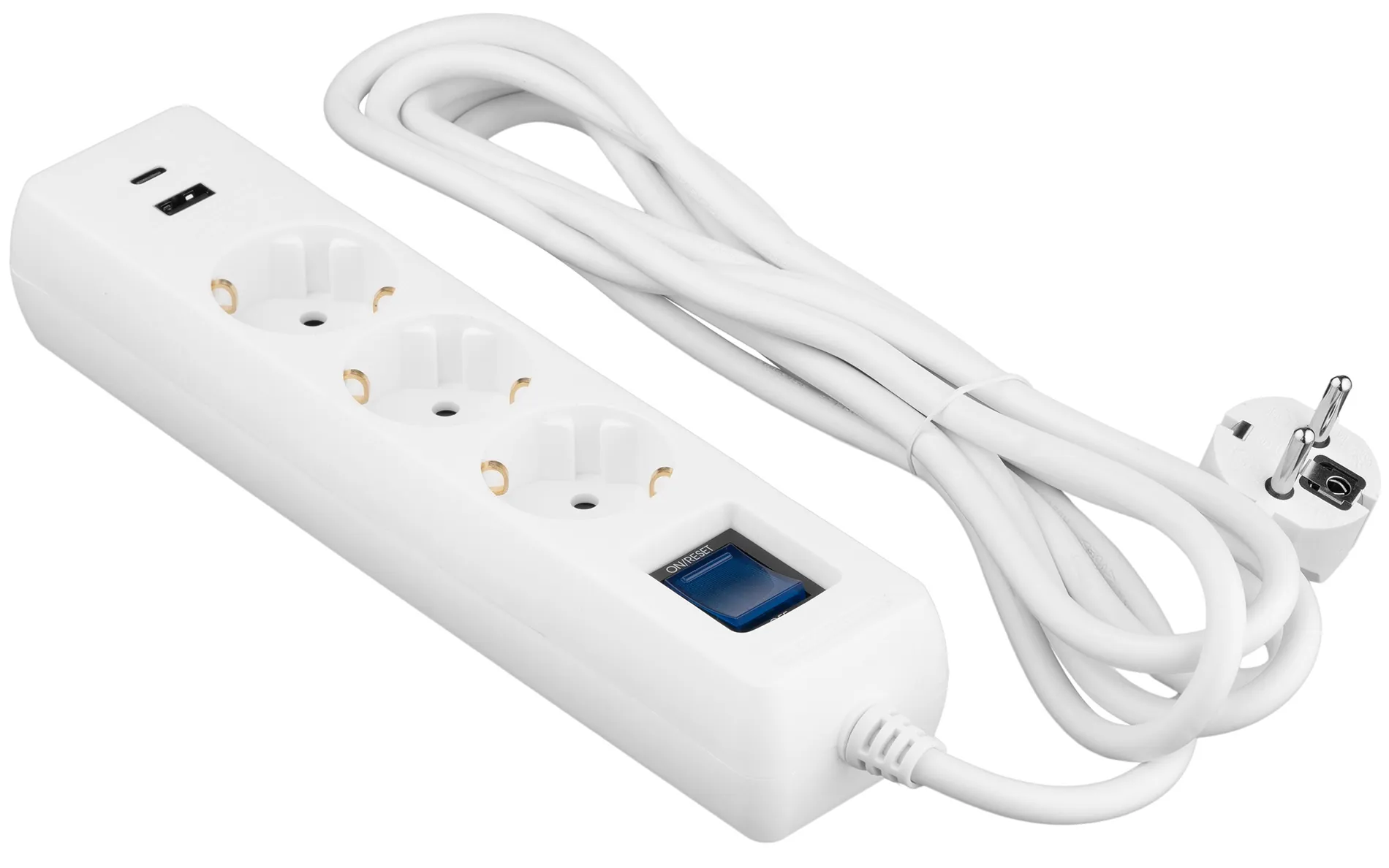 2E Power strip with surge protection, 3m, 3xTypeF, 16A, 1xUSB-A,1xUSB-C, white