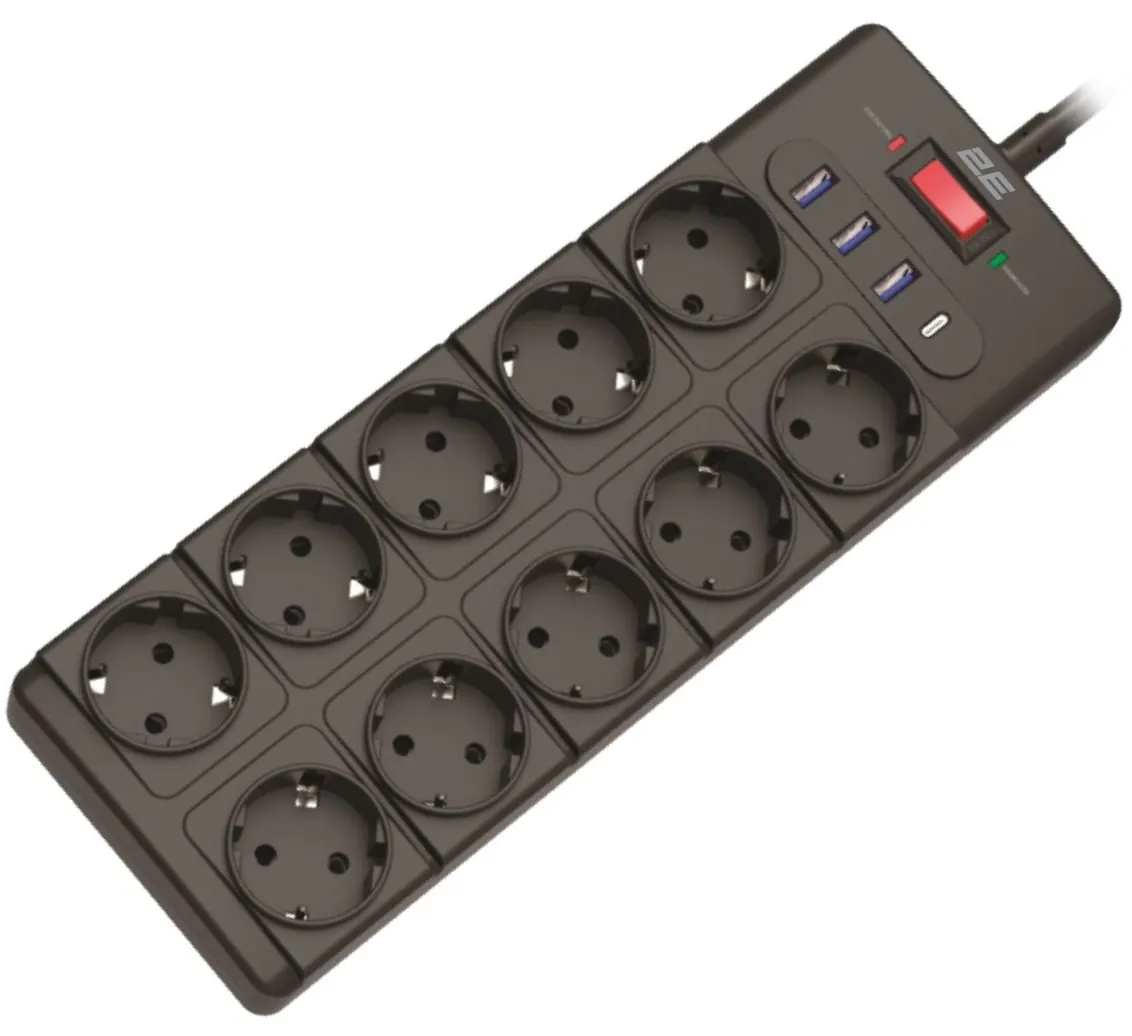 2E Power strip with surge protection, 3m, 10xTypeF, 16A, 3xUSB-A, 1xUSB-C, black