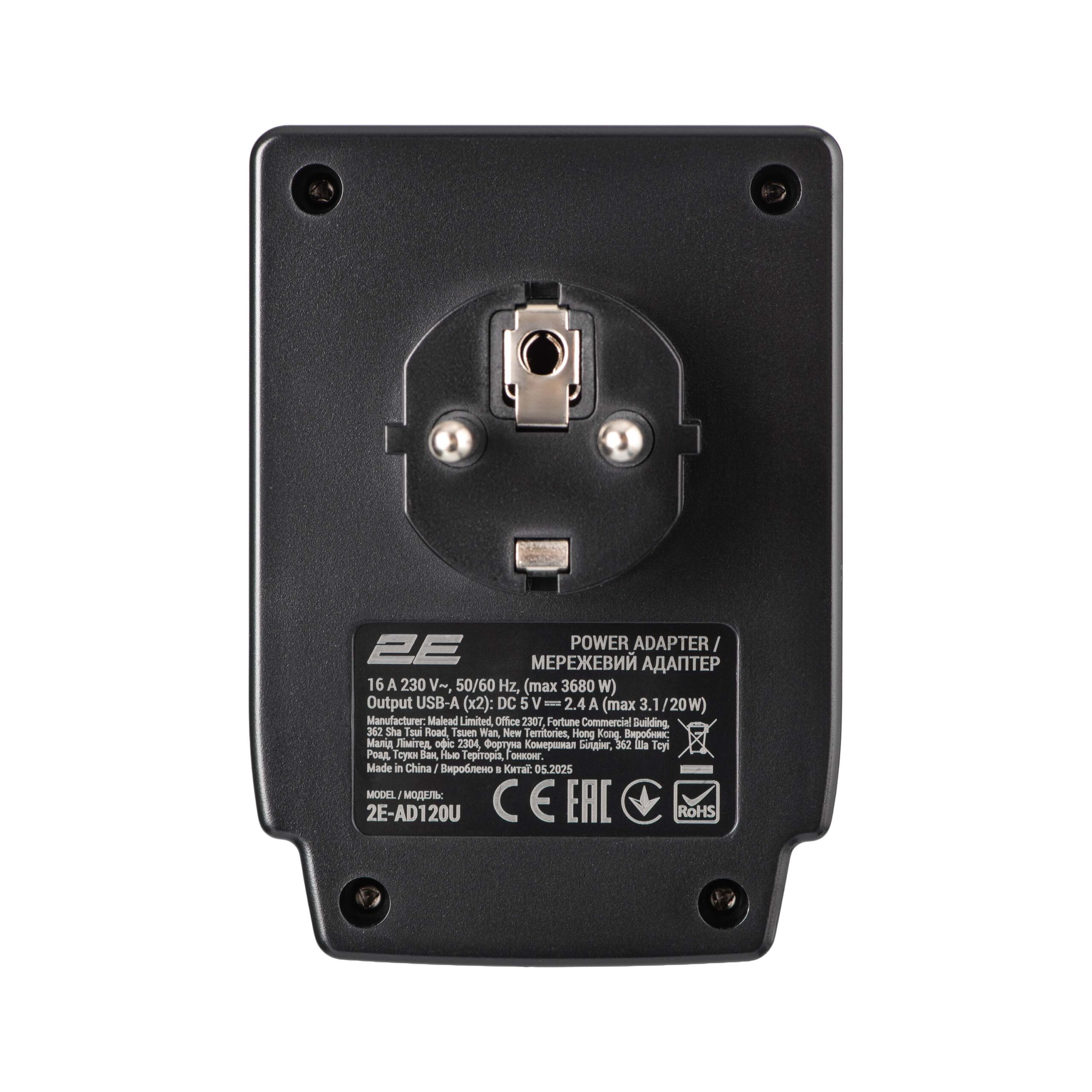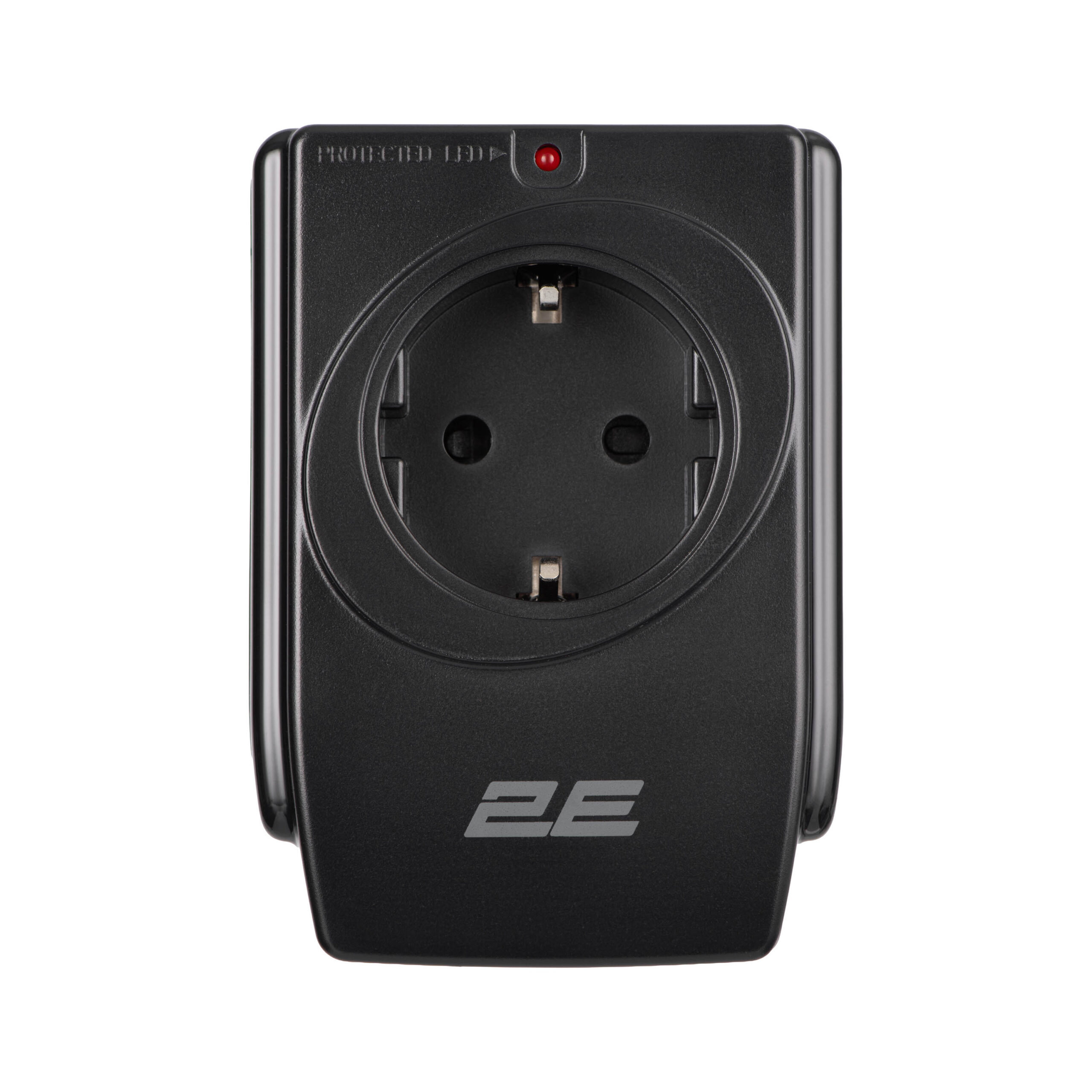 Адаптер мережевий 2E 1xТипF, 16A, 2*USB-A, фільтр, чорний