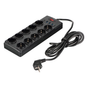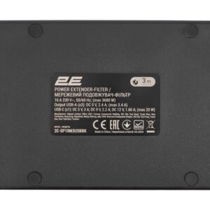 Зручна кнопка вимкнення дає змогу швидко відключити всі пристрої одним натисканням. На зворотній стороні є отвори для кріплення, завдяки чому подовжувач можна встановити горизонтально на підлозі чи вертикально на стіні. Довжина кабелю становить 3 м, провідник – 100 % мідь H05VV-F 3G × 1,5 мм².