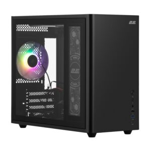 В корпусе установлены 3х120мм ARGB вентилятора (2E-ACF120VB-ARGB) на верхней и задней панелях. Возможно установить двух секционных систем жидкостного охлаждения (240мм) на верхнюю панель. Для подключения, управления и контроля компьютерной периферии в арсенале корпуса есть разъемы 1xUSB3.0, 1х USB 2.0, 1xUSB Type-C, HD AUDIO+MIC, кнопки и индикаторы Power, LED, HDD LED, расположенные на передней панели. Это удобно в процессе эксплуатации.
