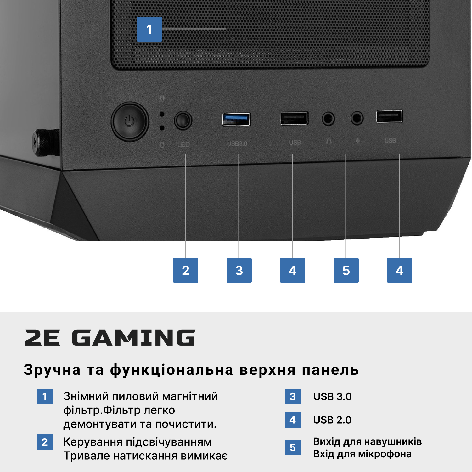 1x USB 3.0 / 2x USB 2.0 / Power / Reset / HD Audio+MIC / Power LED / HDD LED |