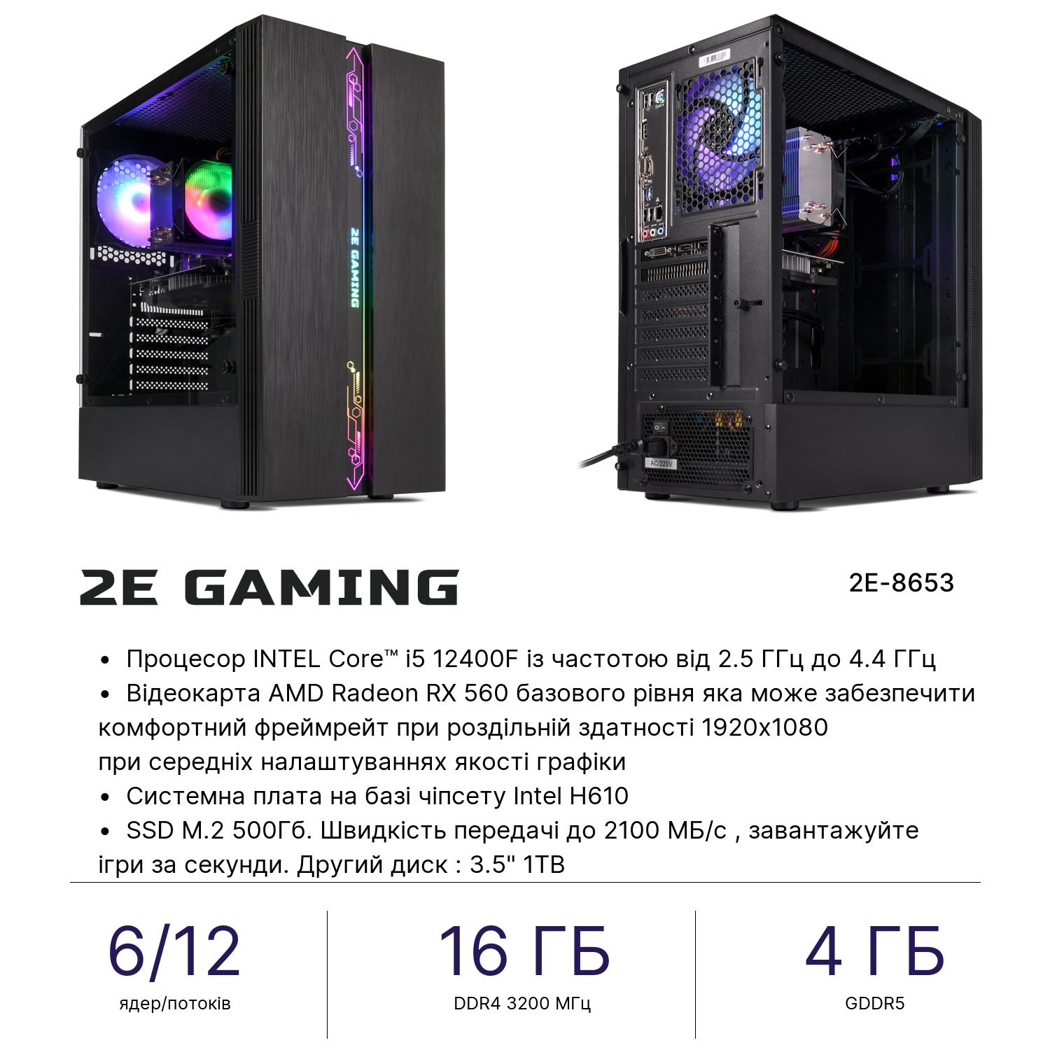 2E 2E PC Complex Gaming Intel i5-12400F/H610/16/500F+1000/RX560-4/FreeDos/2E-G2107-500