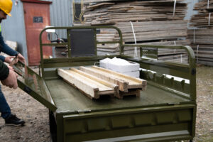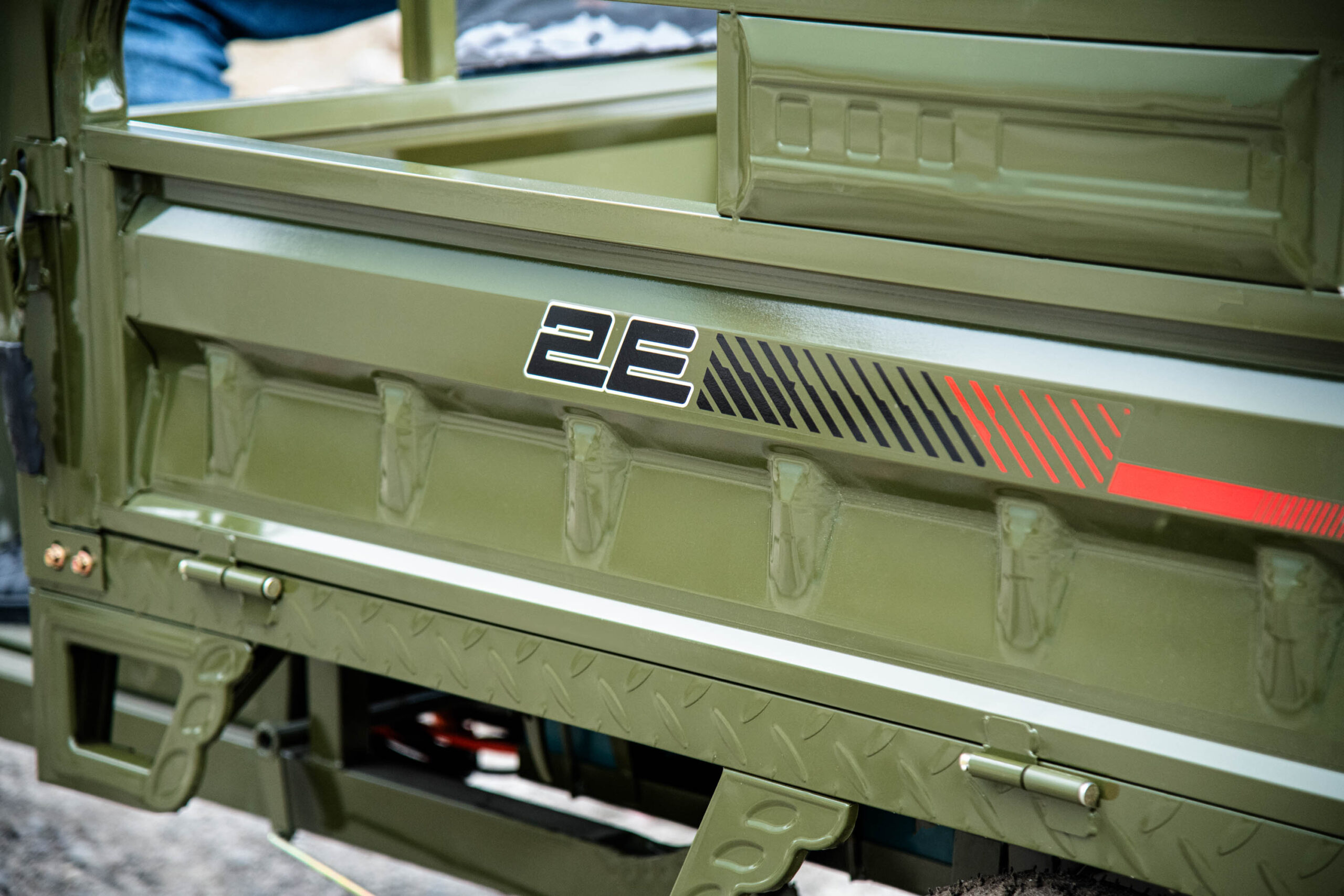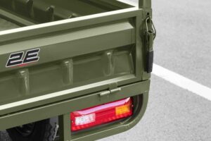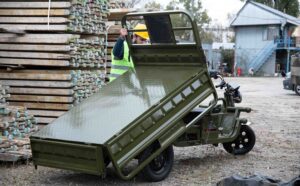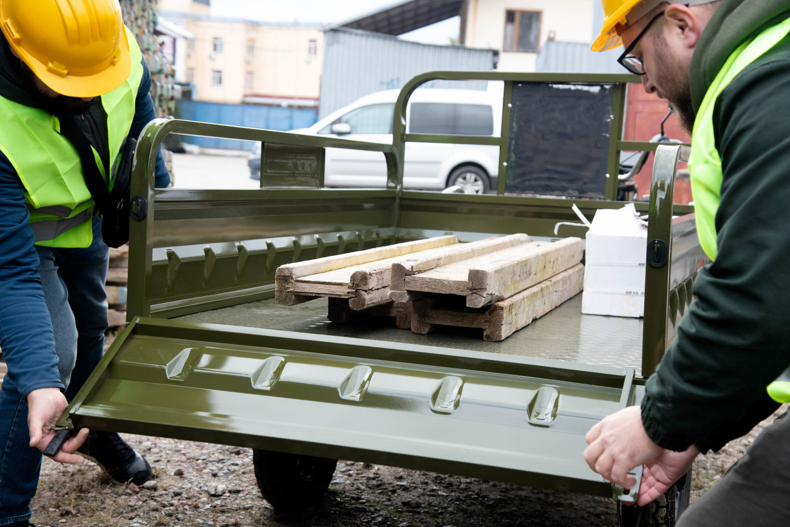 - Cargo compartment: manual lifting dump-style mechanism with gas strut and drop-down side panels