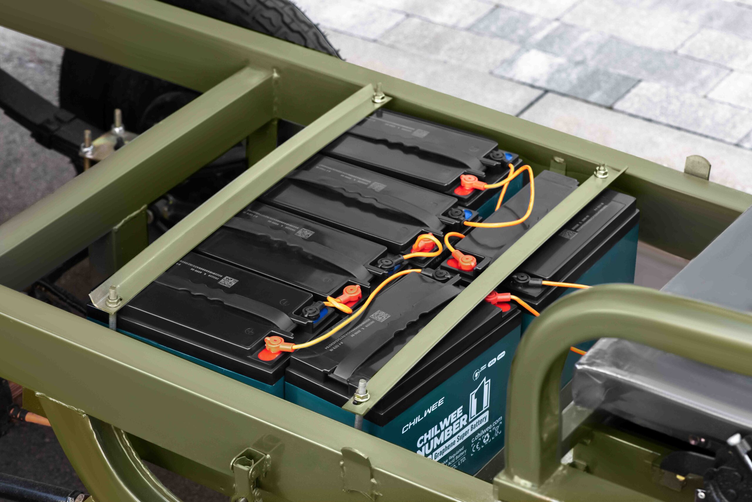 - Battery: traction lead-gel batteries, 72V, 45 Ah