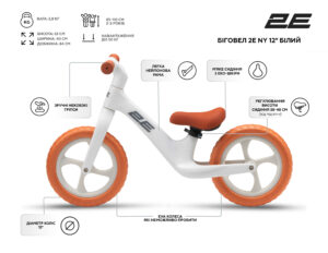 2Е NY – легкий та маневрений біговел для дітей від 2 до 5 років. Така модель стане в пригоді як «проміжний» варіант перед катанням на звичайному велосипеді. Завдяки легкій та міцній нейлоновій рамі (вага лише 2,8 кг) цей біговел забезпечує комфорт і стабільність під час катання. М’яке сидіння виготовлено з екошкіри, є можливість регулювати його за висотою (від 38 до 48 см), забезпечуючи малечі зручність і комфорт. 12-дюймові колеса, які виготовлено з матеріалу EVA, гарантують ліпше зчеплення з поверхнею та плавний хід. Цей розмір коліс є оптимальним для дітей від 2 до 5 років, зумовлюючи зручність і стійкість навіть на нерівних поверхнях. Біговел 2Е NY вдало поєднує привабливість, безпеку та надійність.